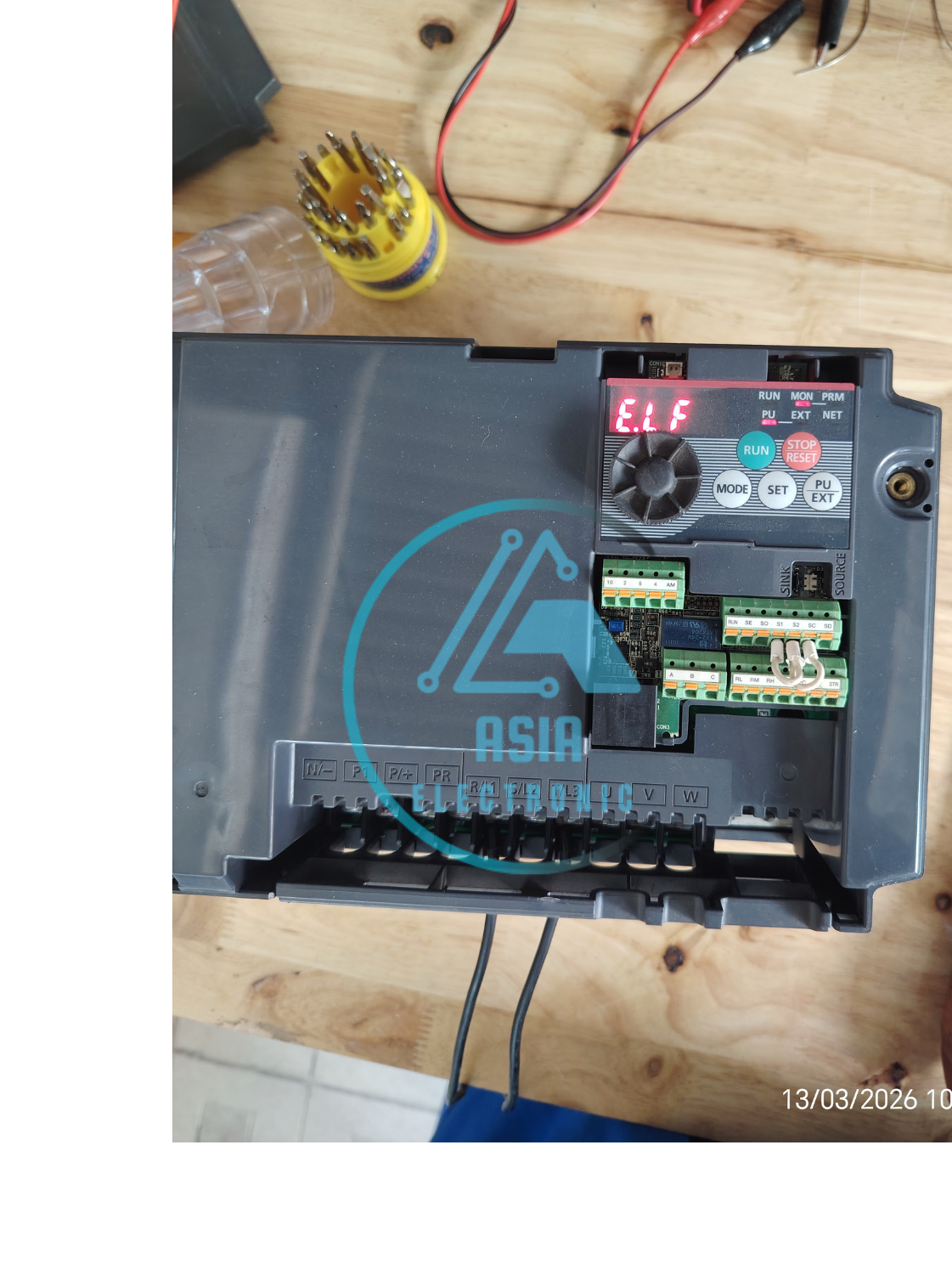 E.LF (Output phase loss) xuất hiện khi một trong ba pha đầu ra U, V, W bị mất trong quá trình biến tần hoạt động.